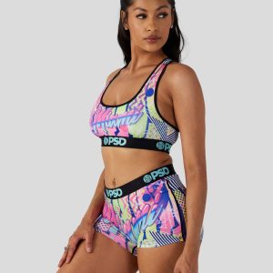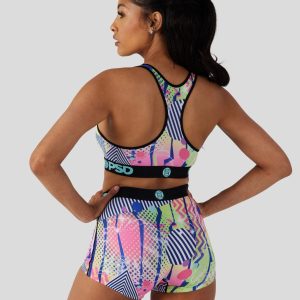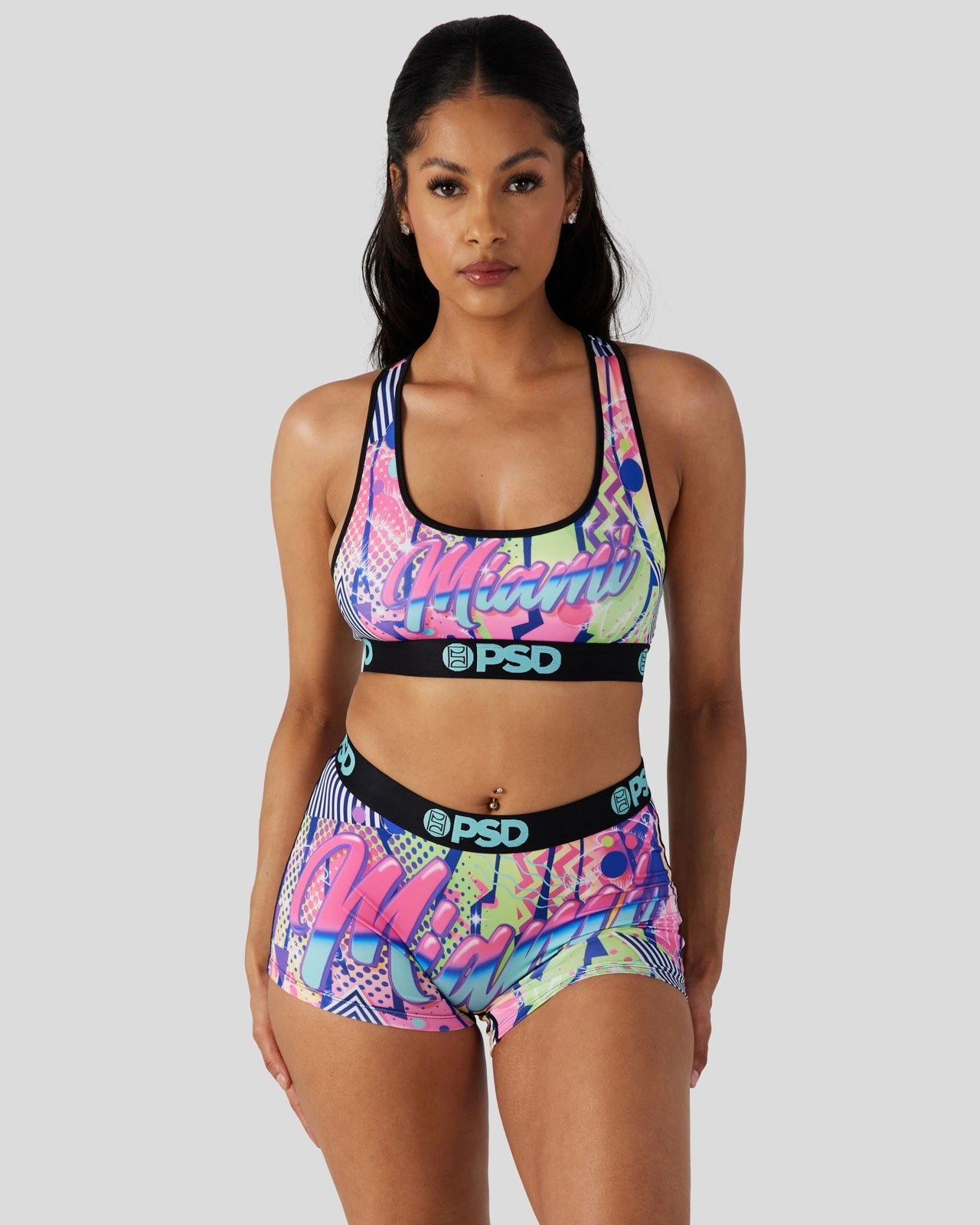 Featuring neon colors and an early ’90s-inspired print. this bra will take you back to a time of big scrunchies. acid wash jeans. and giant hair. Made from a silky poly blend. this the ’90s Miami Sports Bra is breathable yet slightly compressive. bringing you the comfort and support you need for everything you get into.