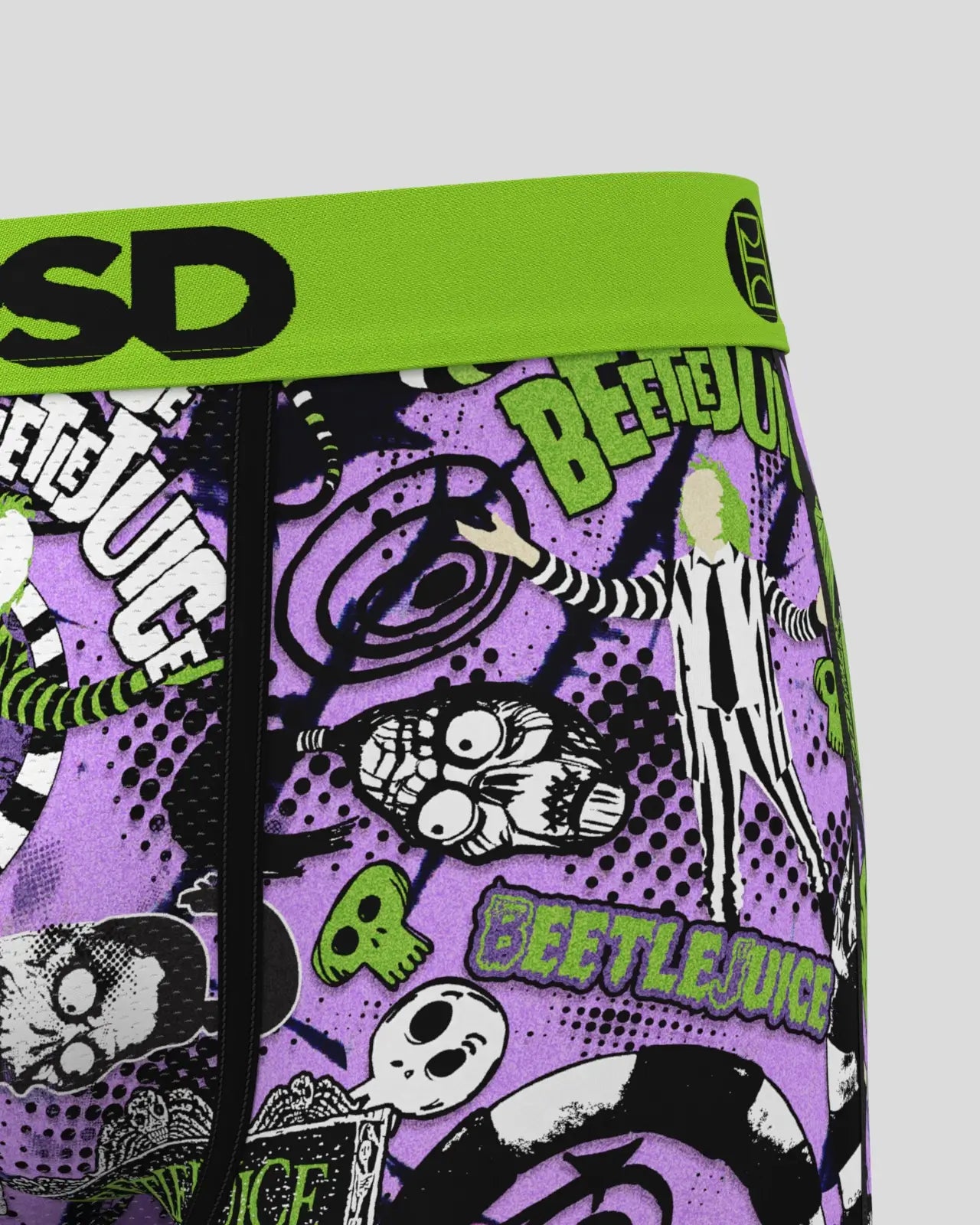 It’s showtime. The ghost with the most is back and ready to crash the Halloween party. The Beetlejuice x PSD briefs include our ultra-comfortable Signature WaistBand. a breathable MicroMesh pouch. and four-way stretch. The PSD 7 Standard Length Briefs won’t roll or ride and were built for everything. from everyday wear to your toughest workouts.