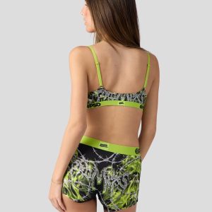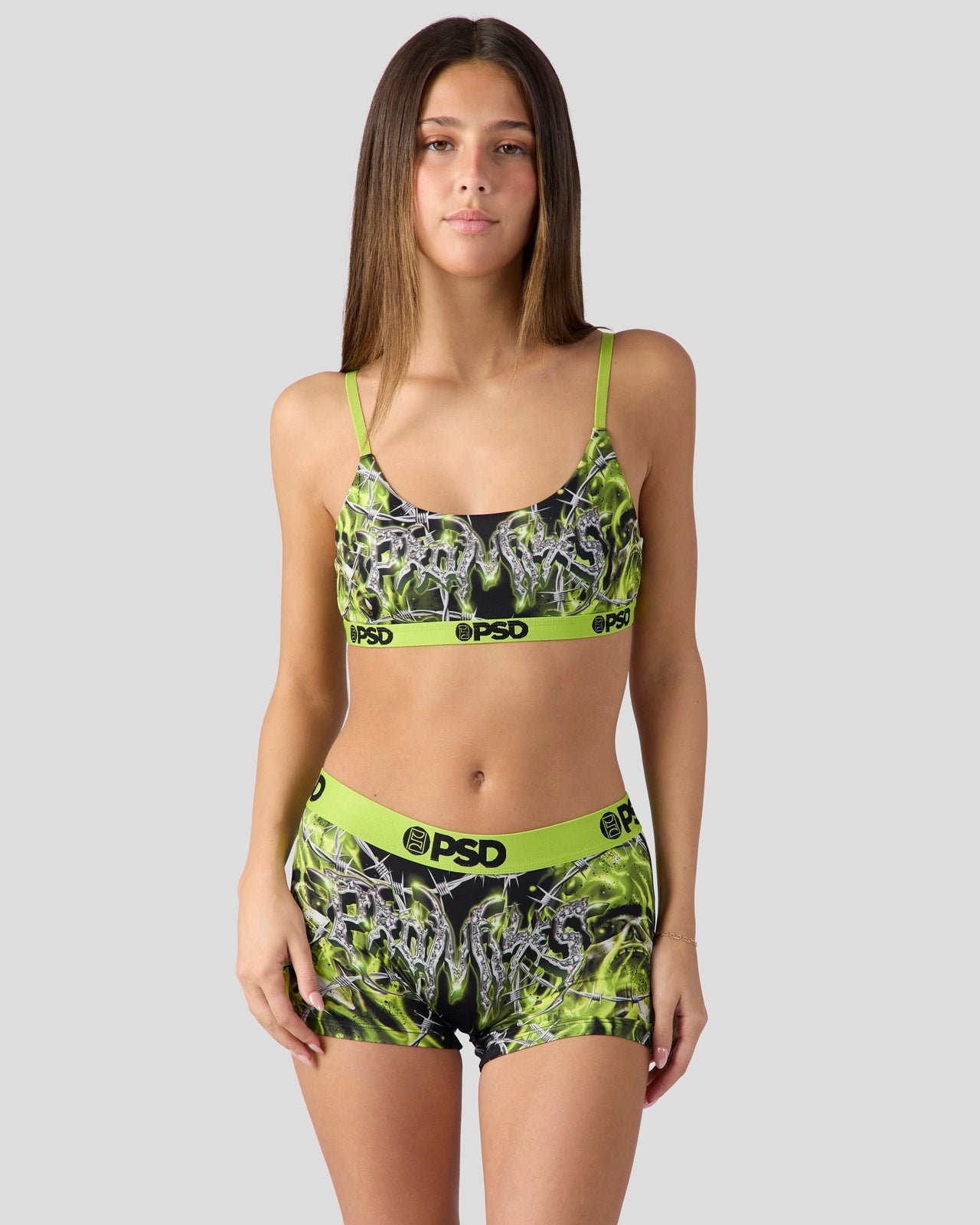 Our first collaboration with Broken Promises is here. Featuring their barbwire print. the Cyberwire Boy Short is made from a silky poly blend with a comfortable full coverage. keep-you-in fit. The PSD boy shorts are perfect for everyday wear and working out.