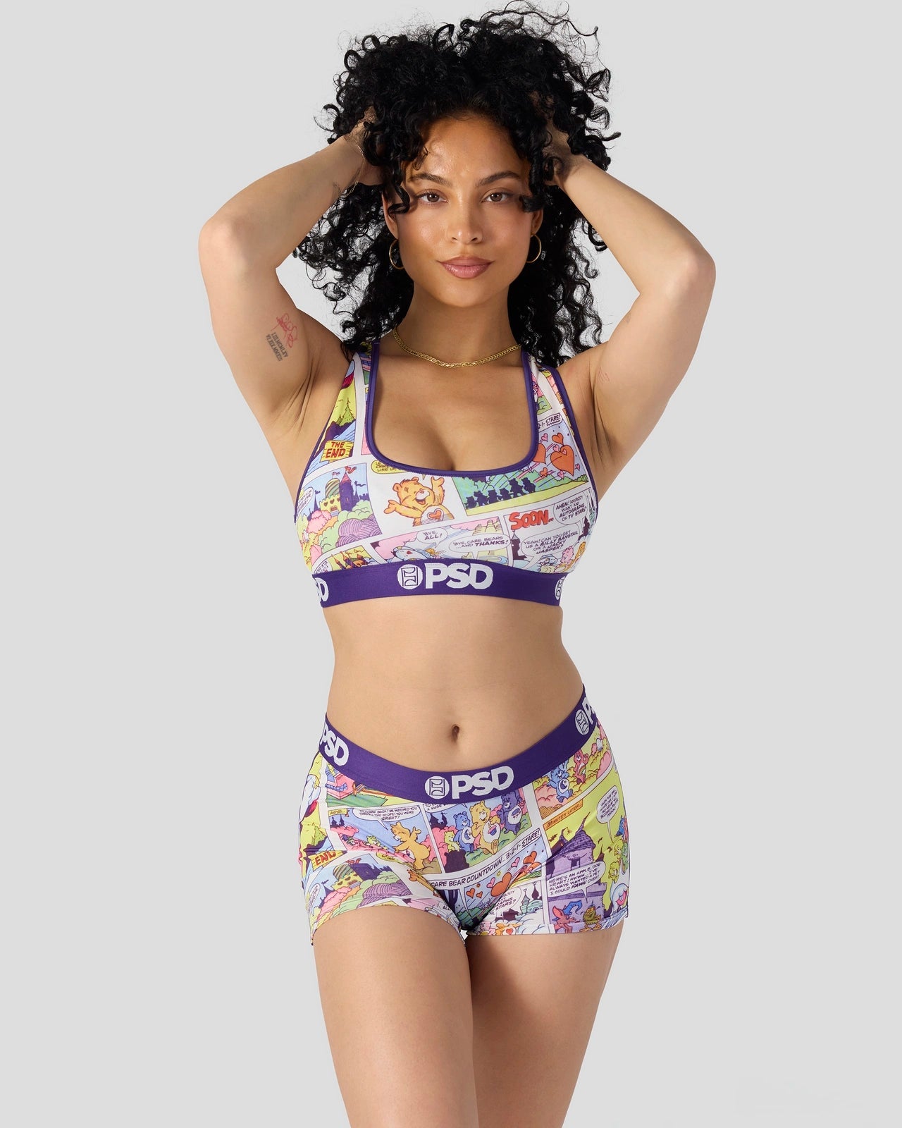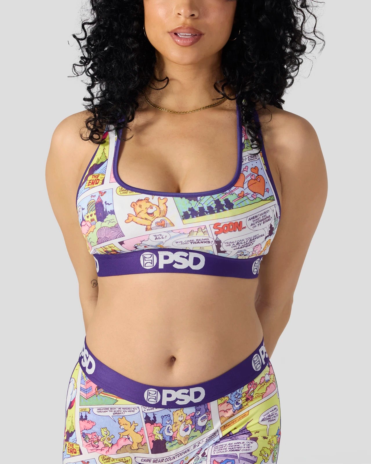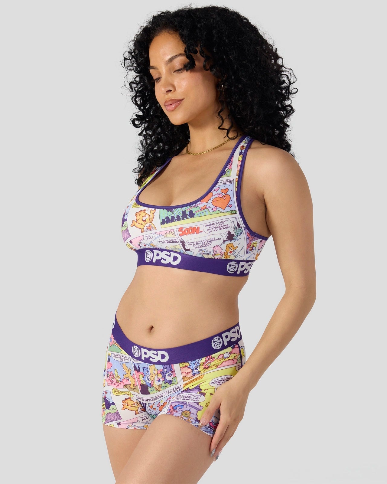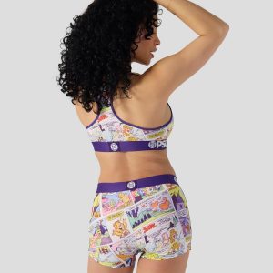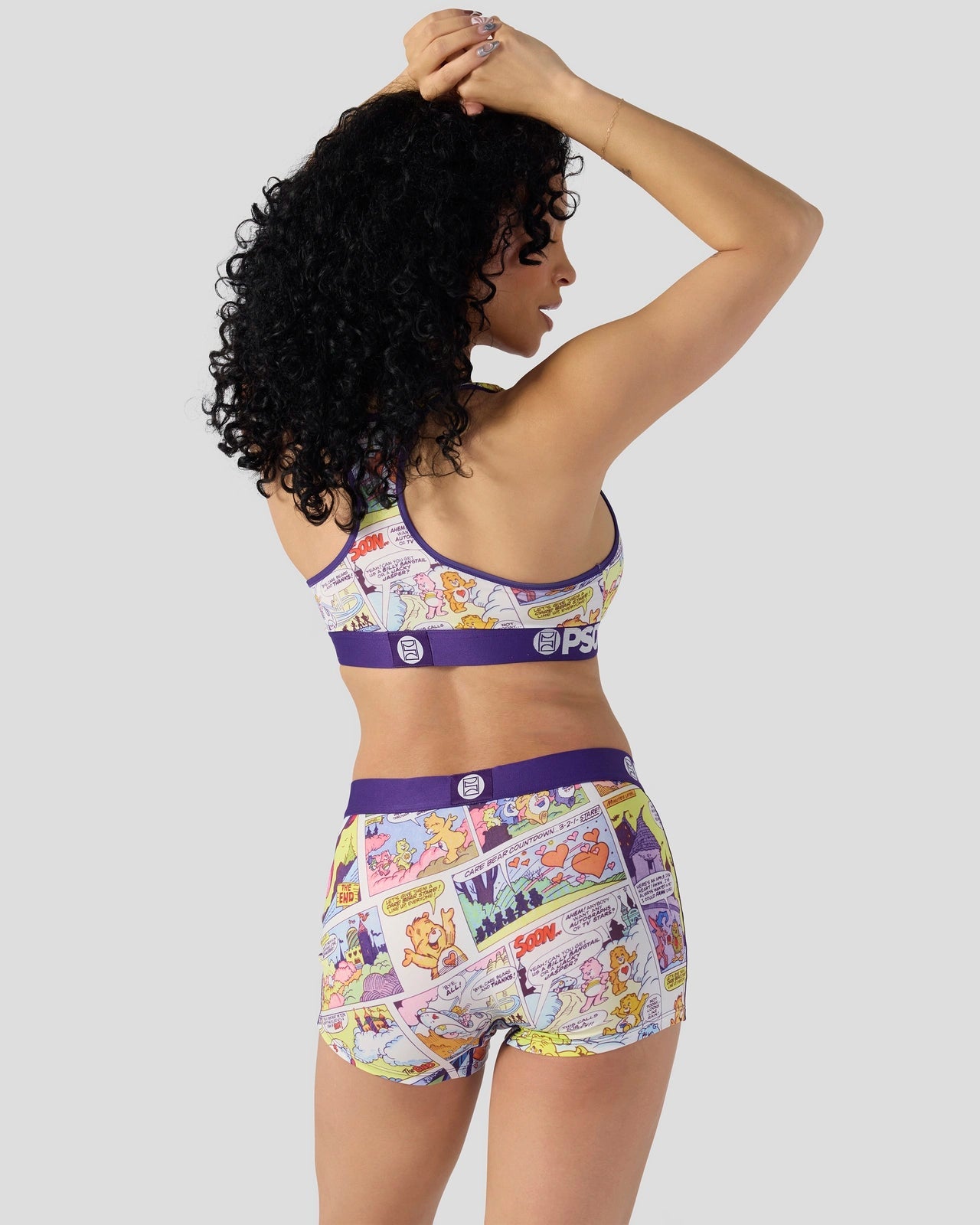 New from Care Bears x PSD! Featuring a comic strip design. the Comic Sports Bra is made from a silky poly blend with a comfortable full coverage. keep-you-in fit. The PSD boy shorts are perfect for everyday wear and working out.