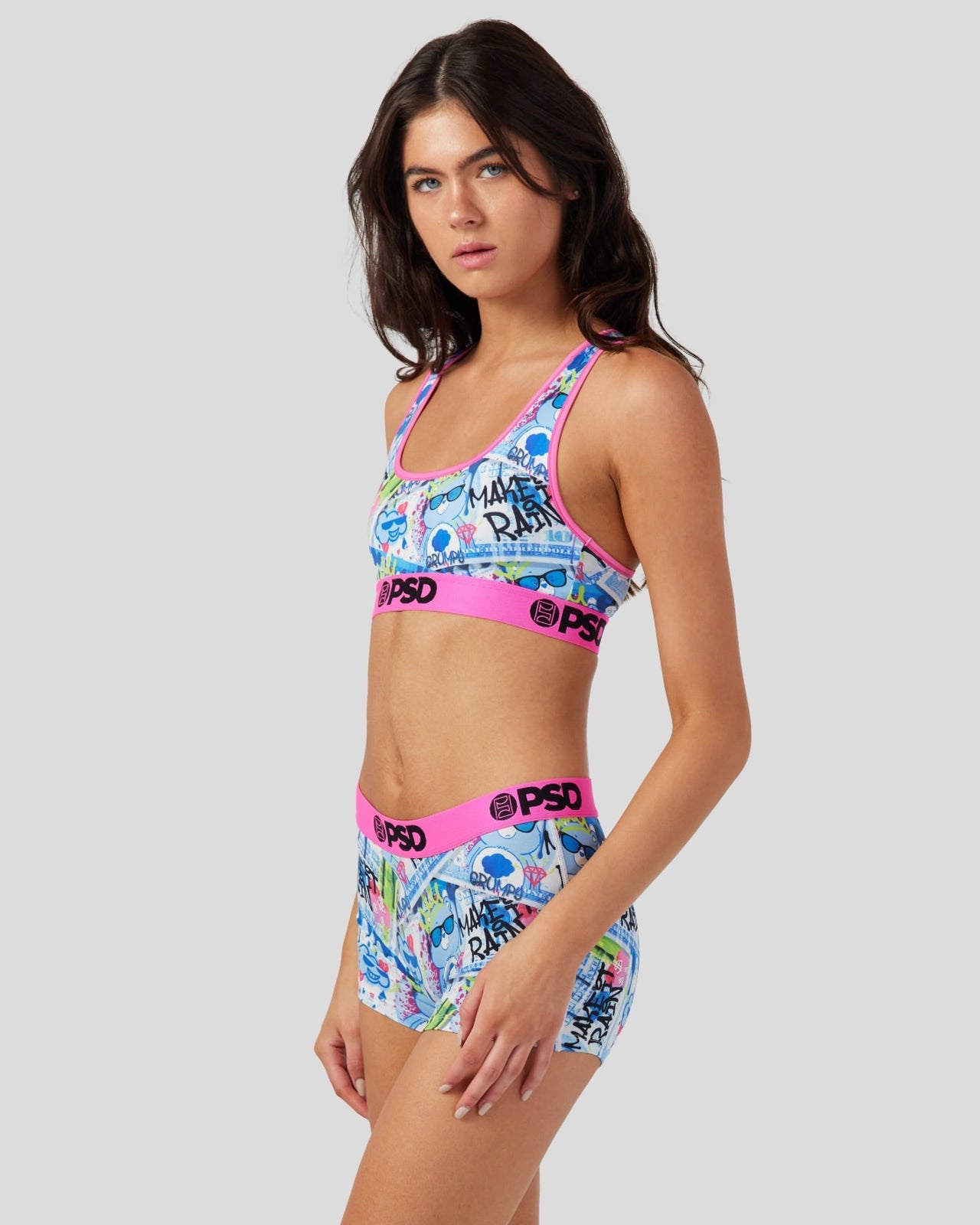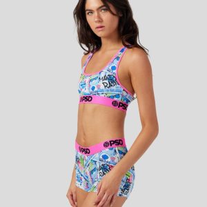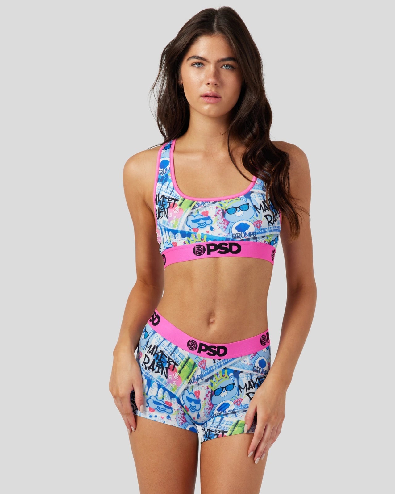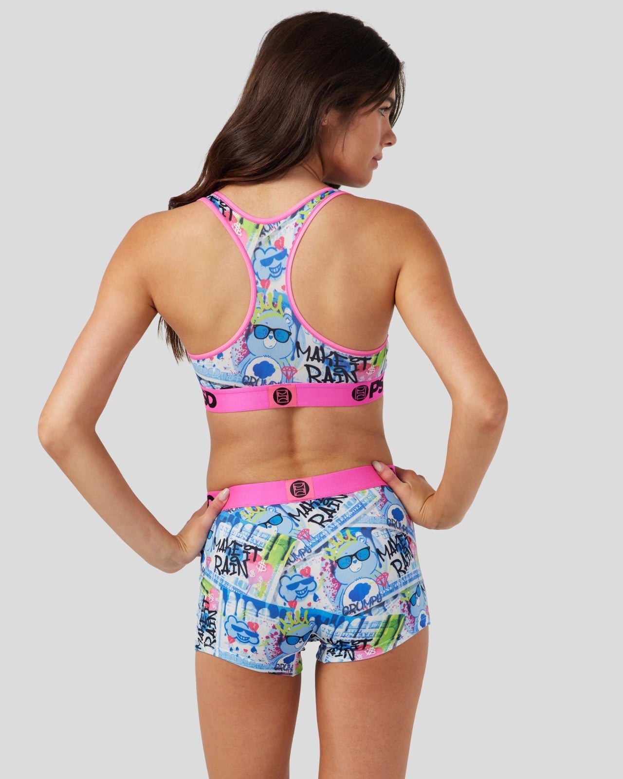 Our newest drop from the Care Bears x PSD collection features your favorite cuddly friends like you’ve never seen them before. The Make it Rain Sports Bra is made with our silky poly blend and is breathable yet slightly compressive. bringing you the comfort and support you need for everything you get into. This style is available in sizes XS – 5XL.