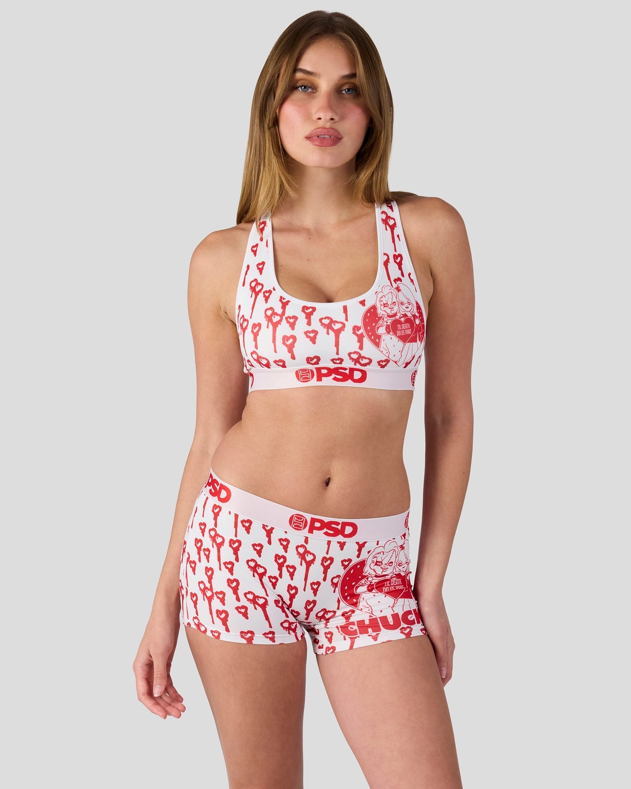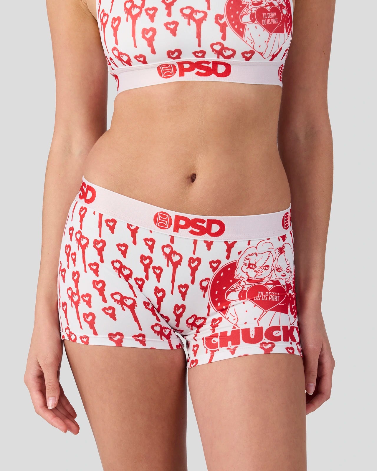 Meet the ultimate horror couple. From Chucky x PSD. this look captures their twisted slashers-in-love chemistry. The ‘Til Death Boy Short is made from a silky poly blend with a comfortable full-coverage. keep-you-in fit. The PSD boy shorts are perfect for everyday wear and working out.