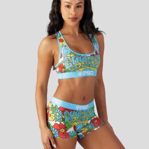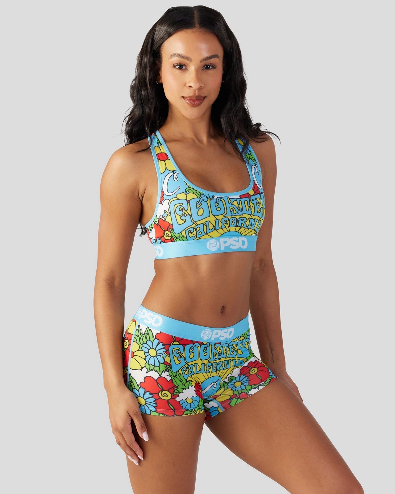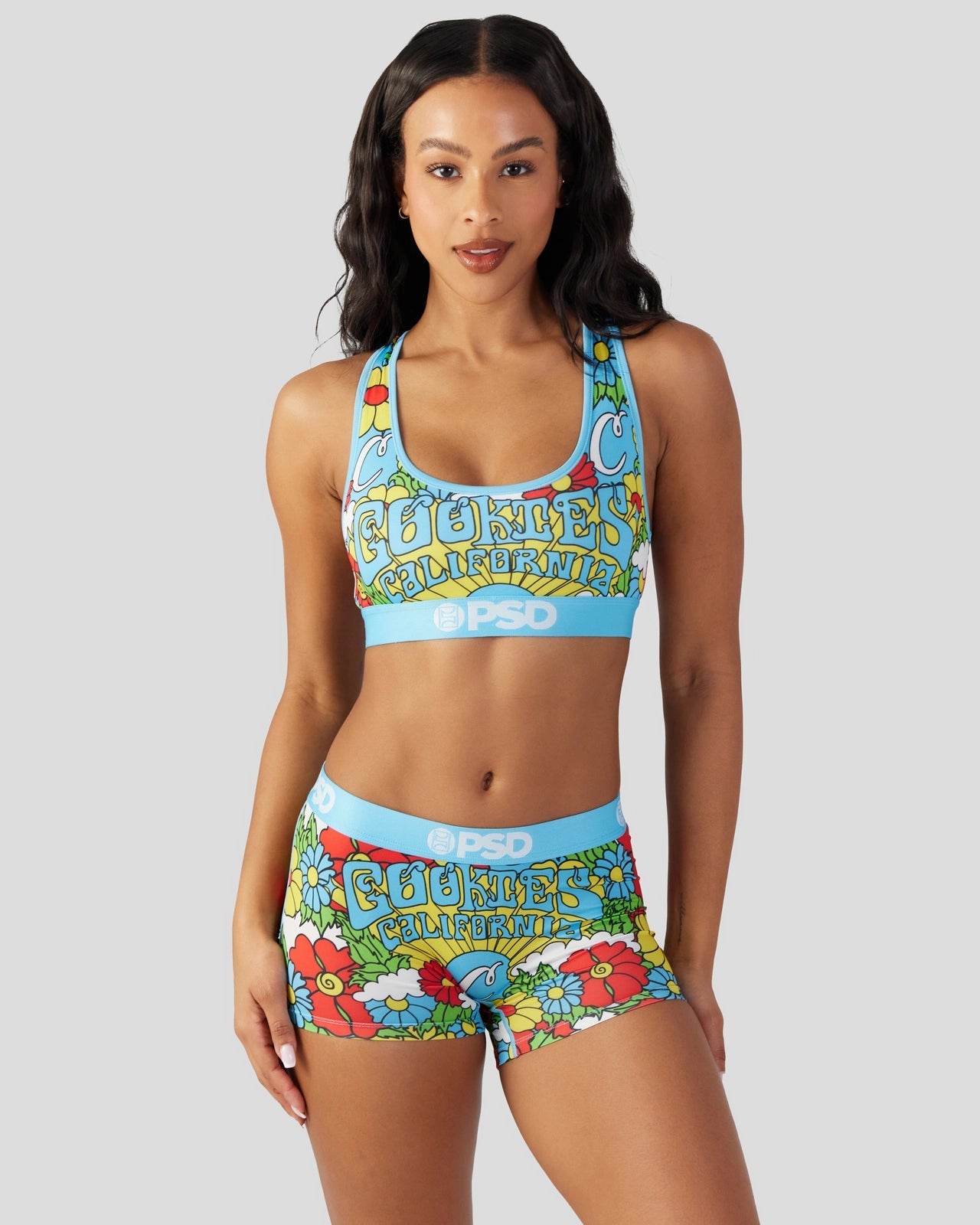 New from Cookies x PSD! With a colorful retro print. the Cali Cookies Sports Bra is made from a silky poly blend with a comfortable full coverage. keep-you-in fit. The PSD boy shorts are perfect for everyday wear and working out.