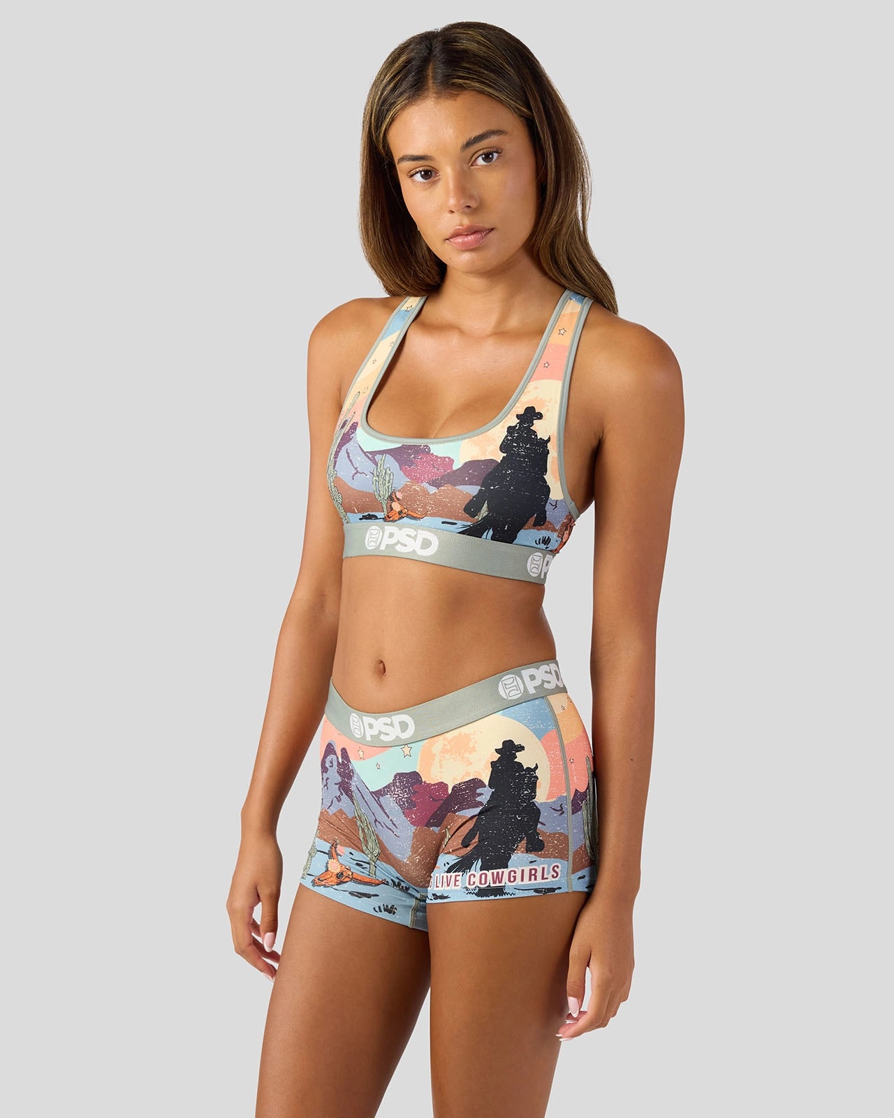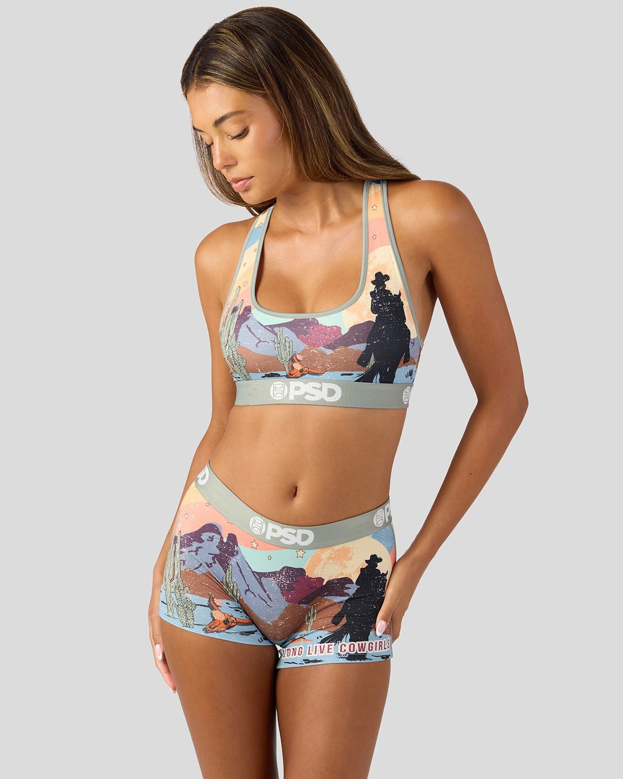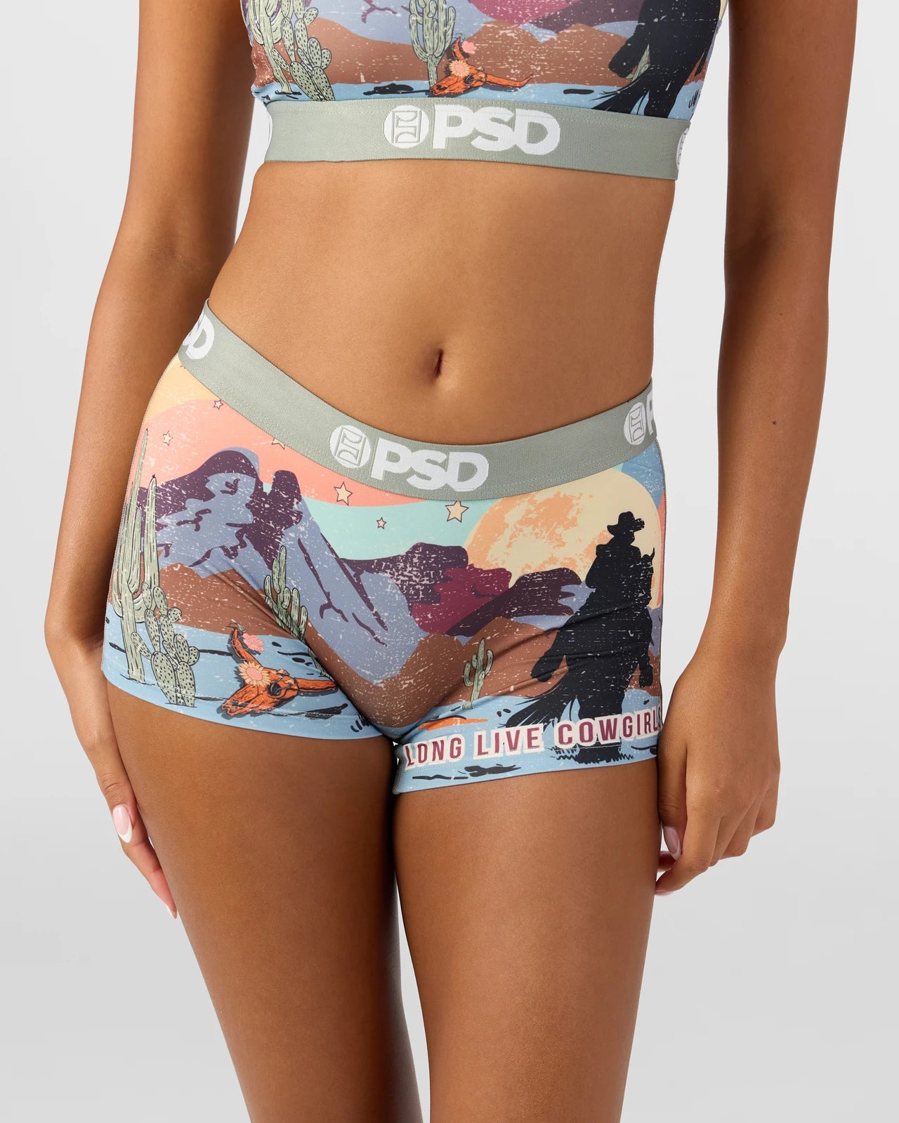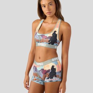 Live out your cowgirl fantasies and ride into the sunset in this new women’s look. The Desert Sunset Boy Short is made from a silky poly blend with a comfortable full-coverage. keep-you-in fit. The PSD boy shorts are perfect for everyday wear and working out.