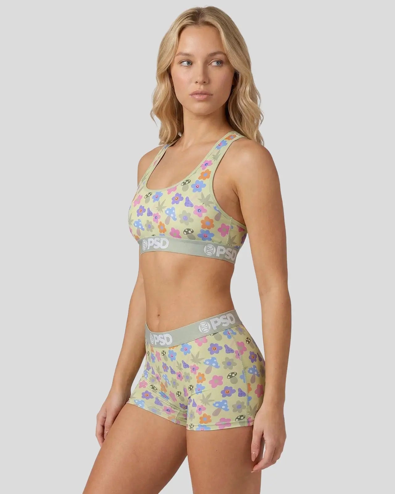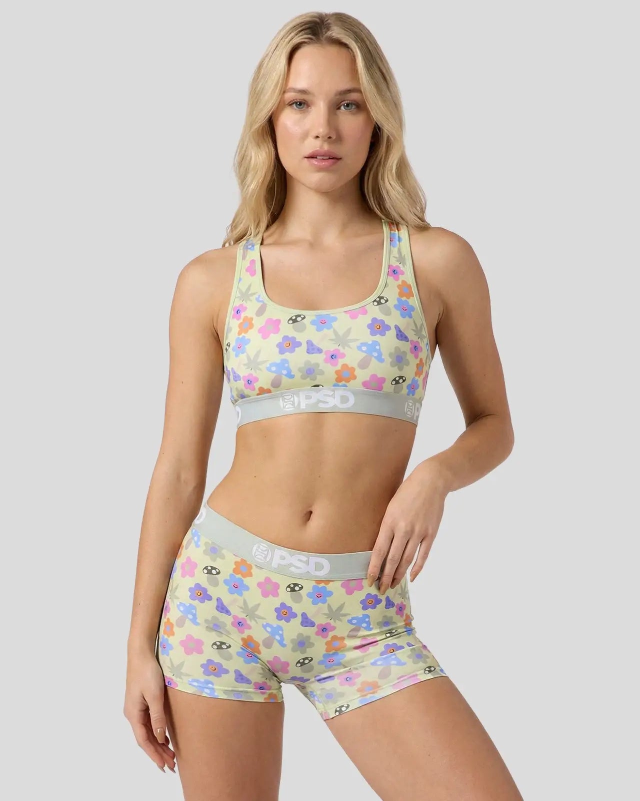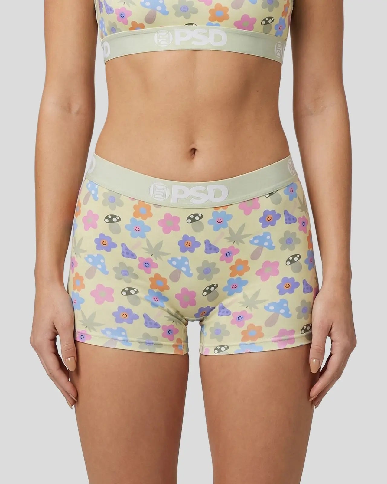 Femme meets fungi. The Ditzy Shroom Boy Short is made from a silky poly-blend with a comfortable full-coverage. keep-you-in fit. The PSD boy shorts are perfect for everyday wear and working out.
