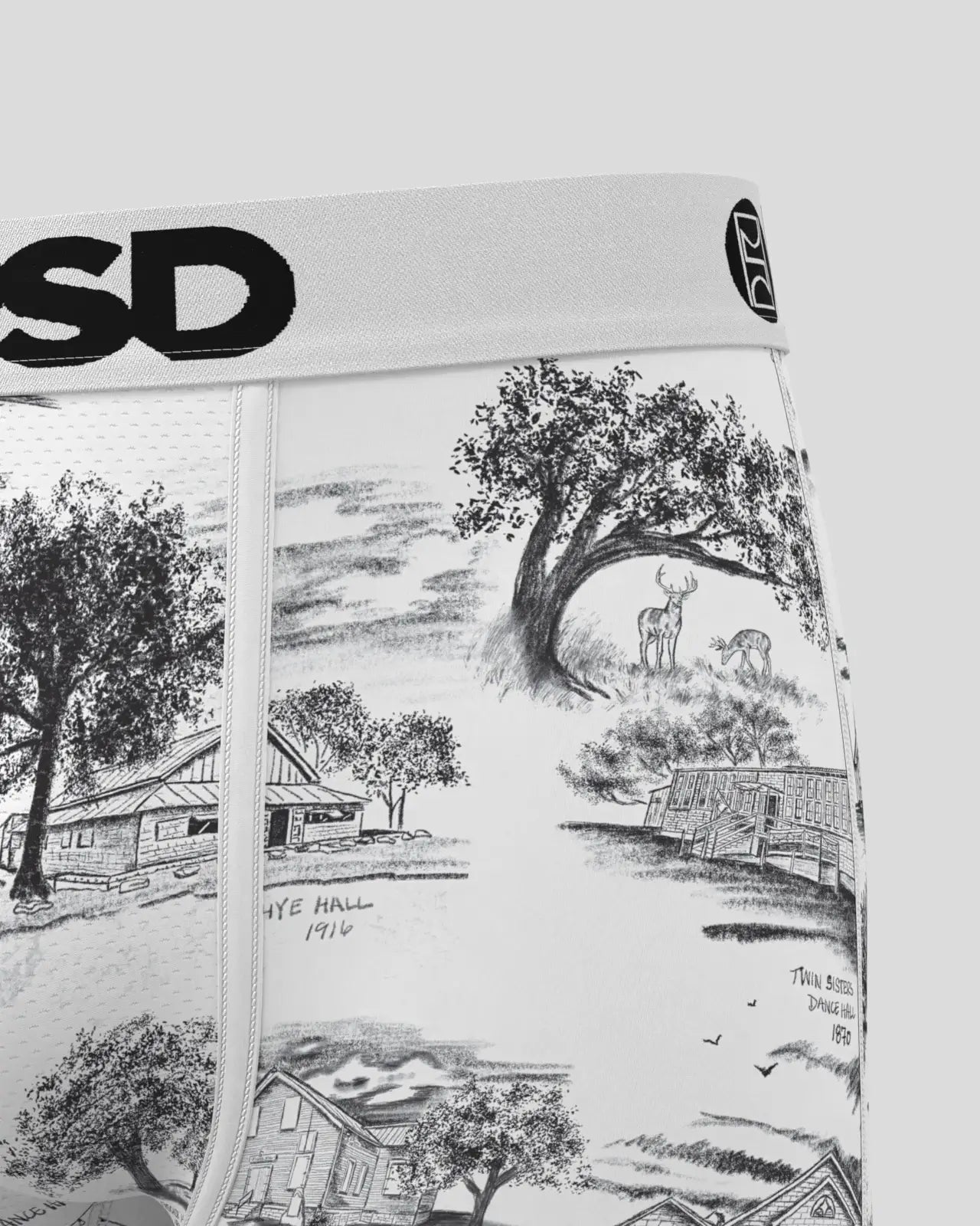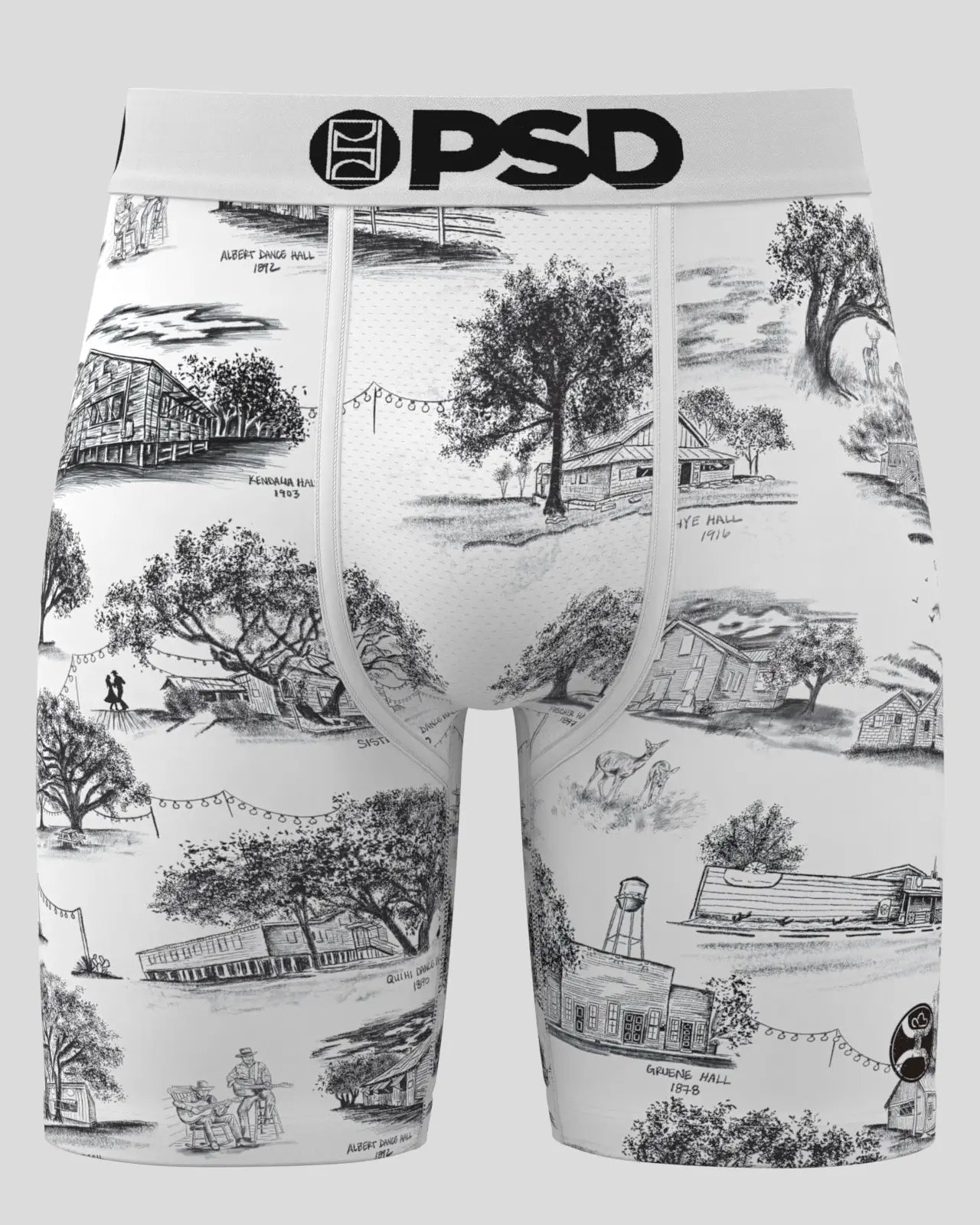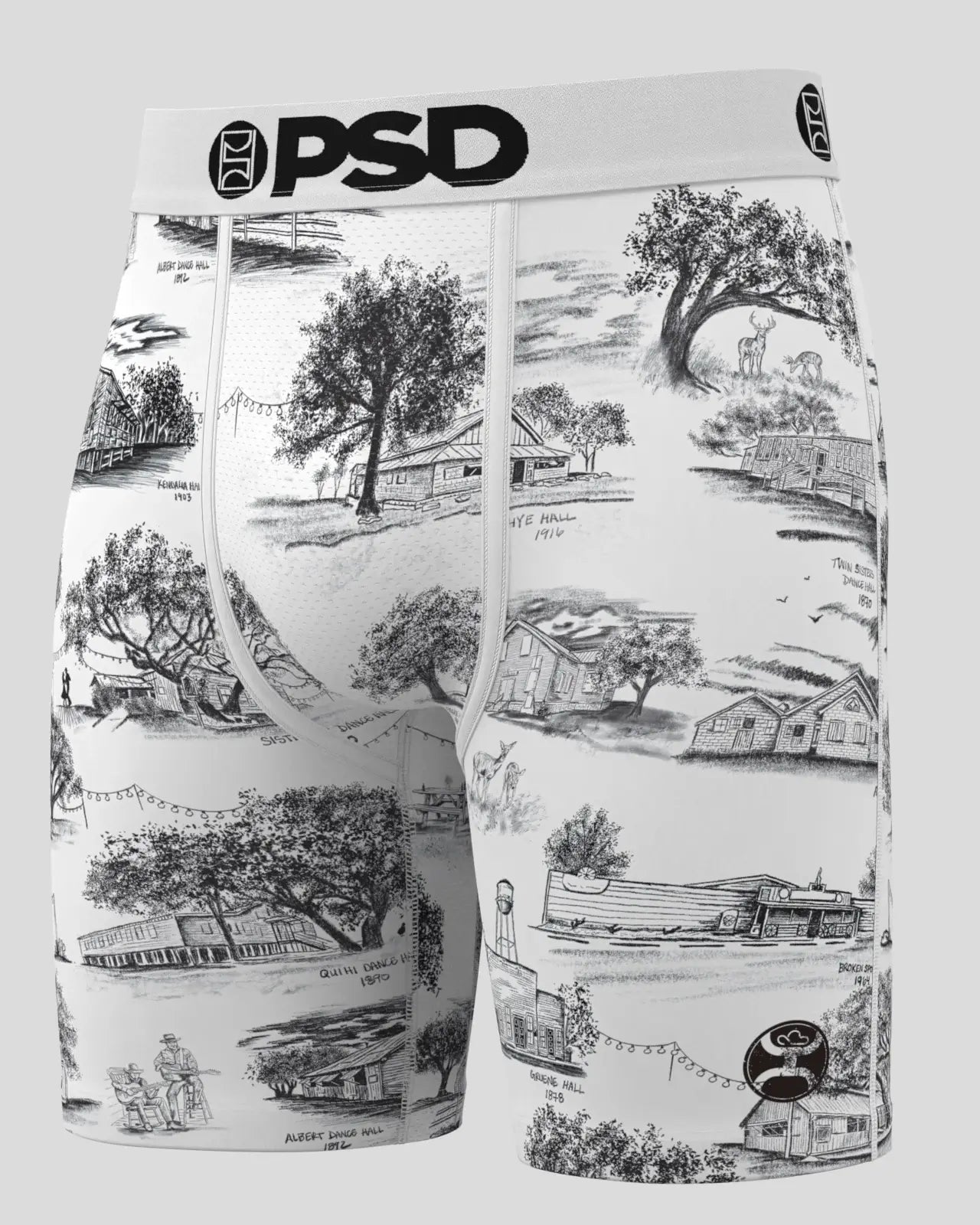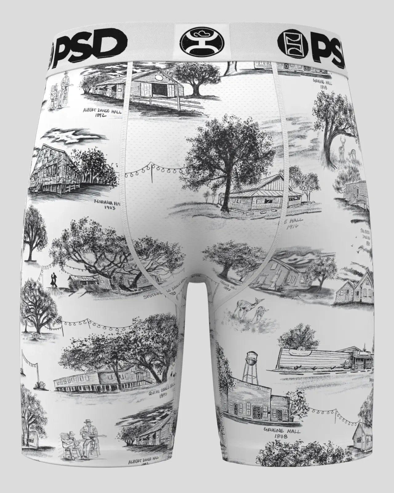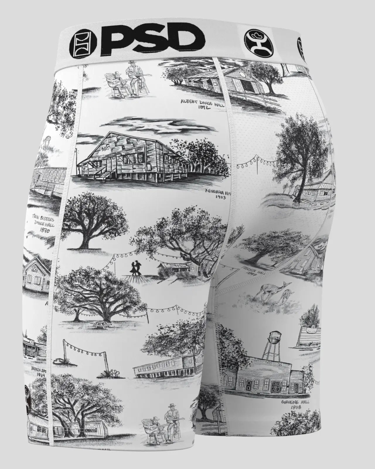 Get ready to do the boot scootin’ and boogie in this style from Hooey x PSD that features well-known. famous dancehalls from South Texas. The Dancehall briefs include our ultra-comfortable Signature WaistBand. a breathable MicroMesh pouch. and four-way stretch. The PSD 7 Standard Length Briefs won’t roll or ride and were built for everything. from everyday wear to your toughest workouts.