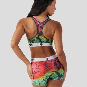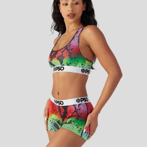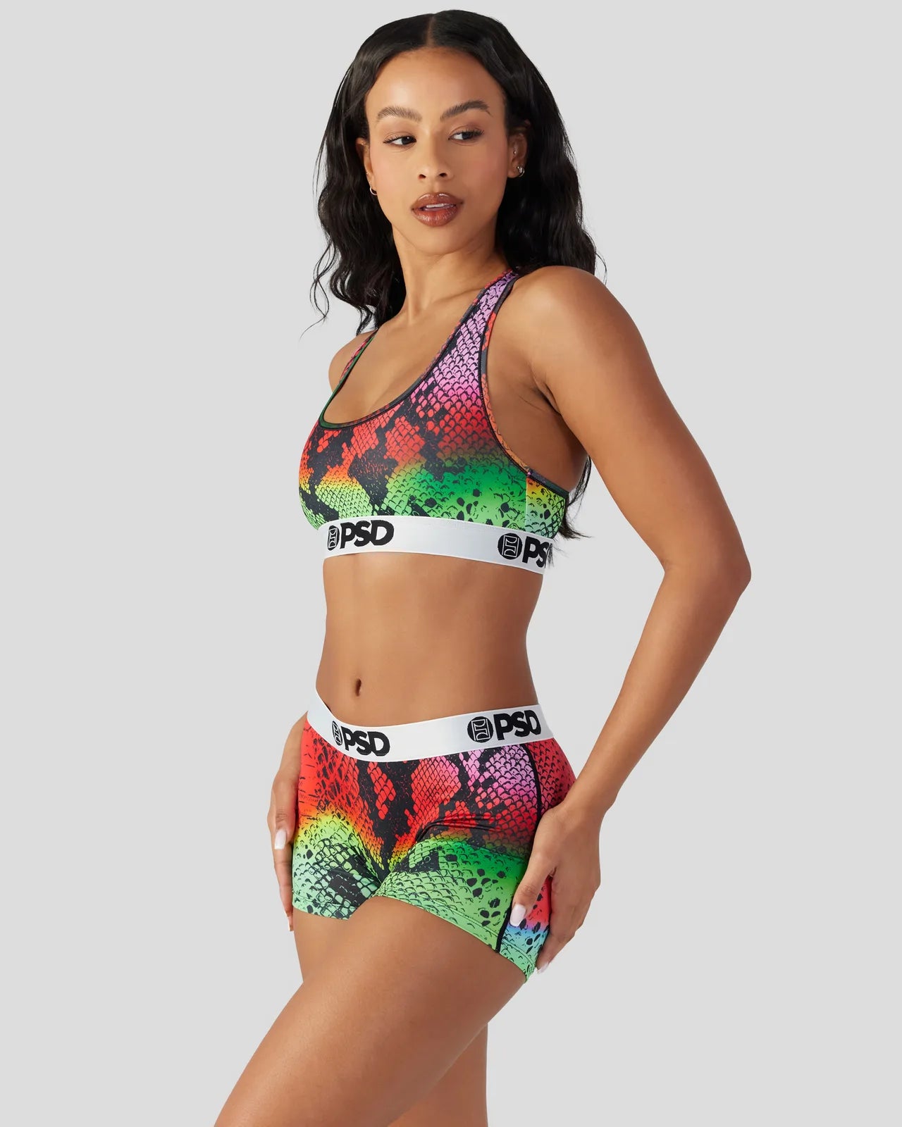 Don’t miss this new women’s color snakeskin-printed drop! The Infrared Snake Sports Bra is made from a silky poly blend with a comfortable full coverage. keep-you-in fit. The PSD boy shorts are perfect for everyday wear and working out.