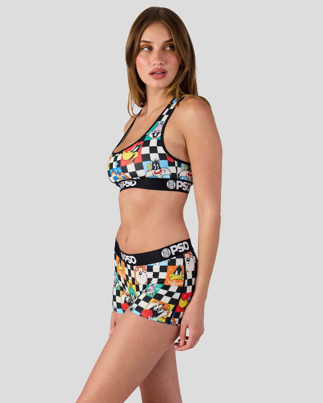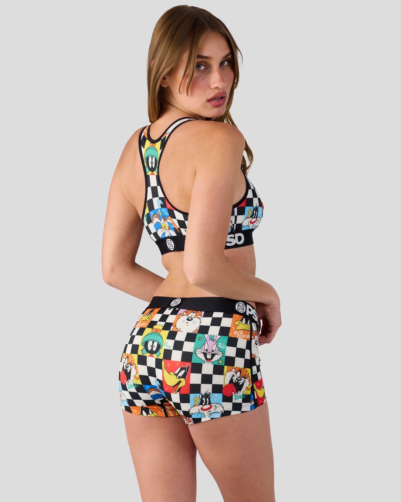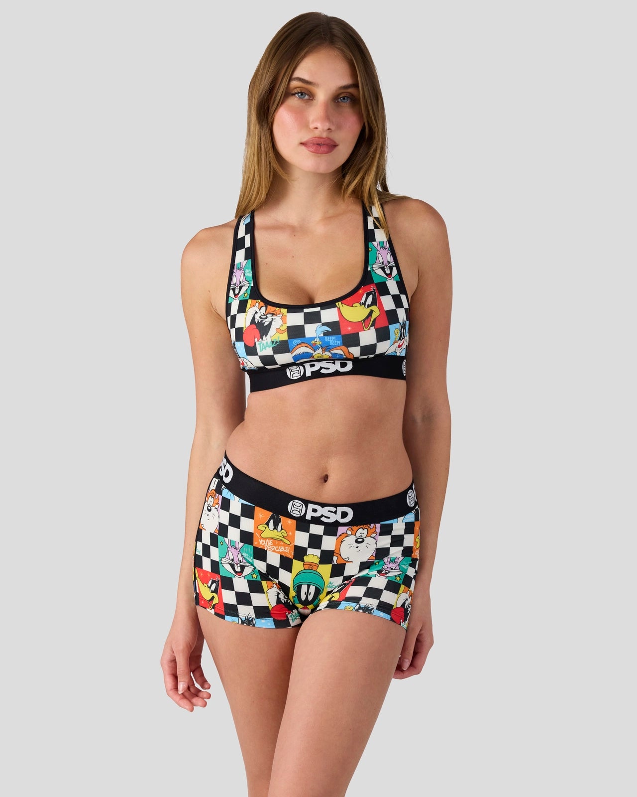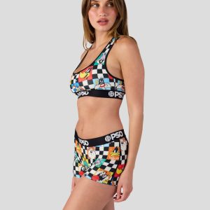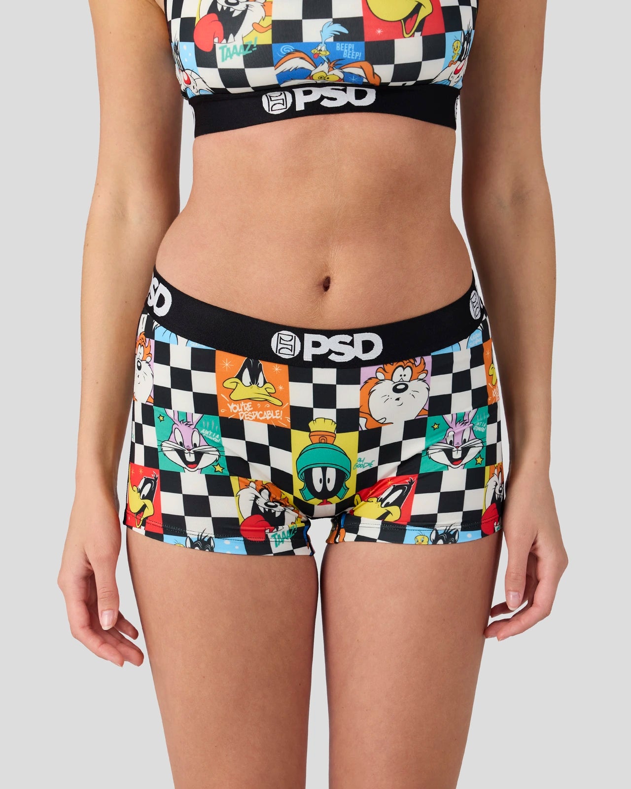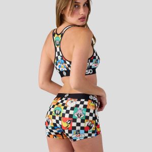 Featuring the whole Looney crew. the Check Boy Short is made from a silky poly blend with a comfortable full coverage. keep-you-in fit. The PSD boy shorts are perfect for everyday wear and working out.