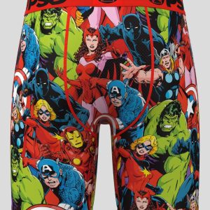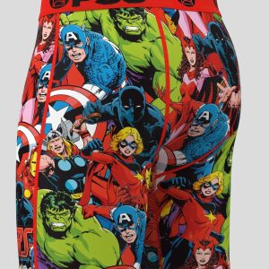 The Marvel – Avengers Standard Length 7 boxer brief features members of the Avengers from the Marvel comics assembled in an all-over print that includes Captain America. Black Panther. Hulk. Thor. Iron Man. Scarlet Witch. and Captain Marvel. With four-way stretch. a breathable MicroMesh pouch. and durable flatlock stitching. these Avengers boxers were built to hold up for everything from everyday wear to the toughest workouts. Whether purchasing as the perfect gift for someone or placing an order for yourself. these Avengers boxers will provide comfort under your apparel for any activity.