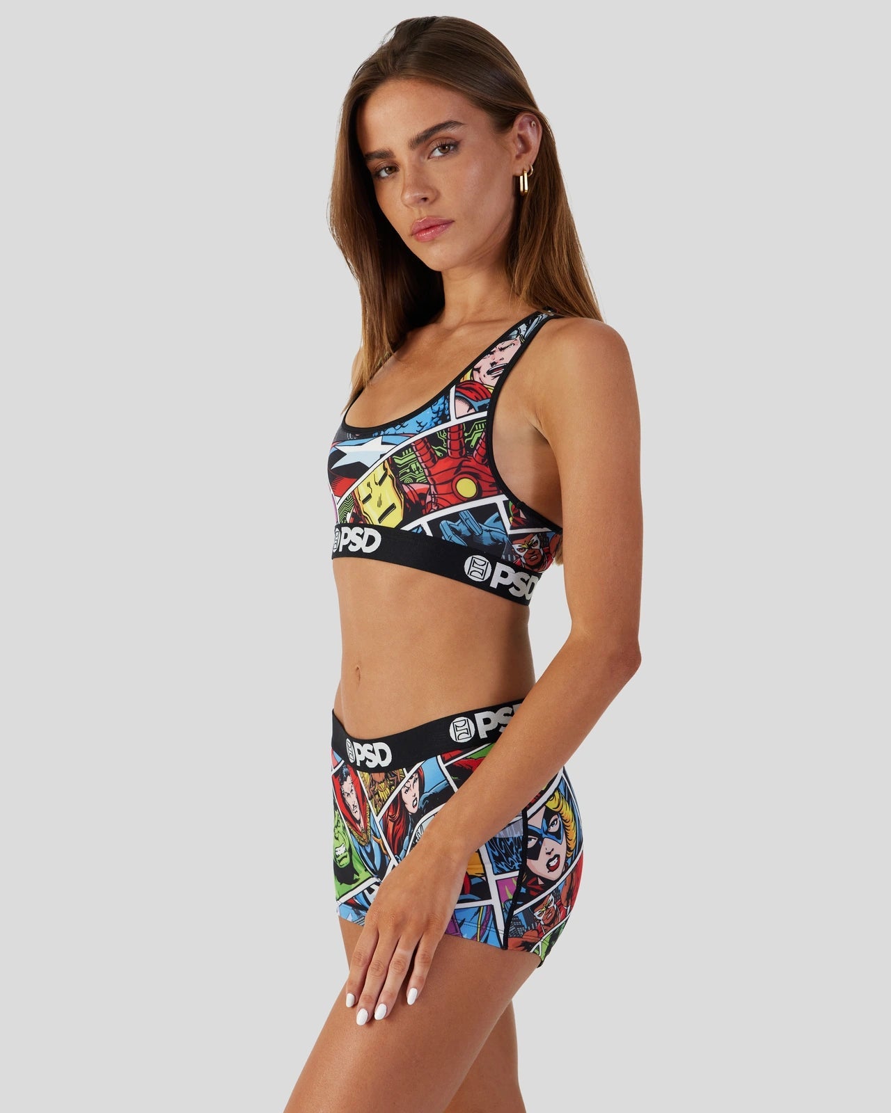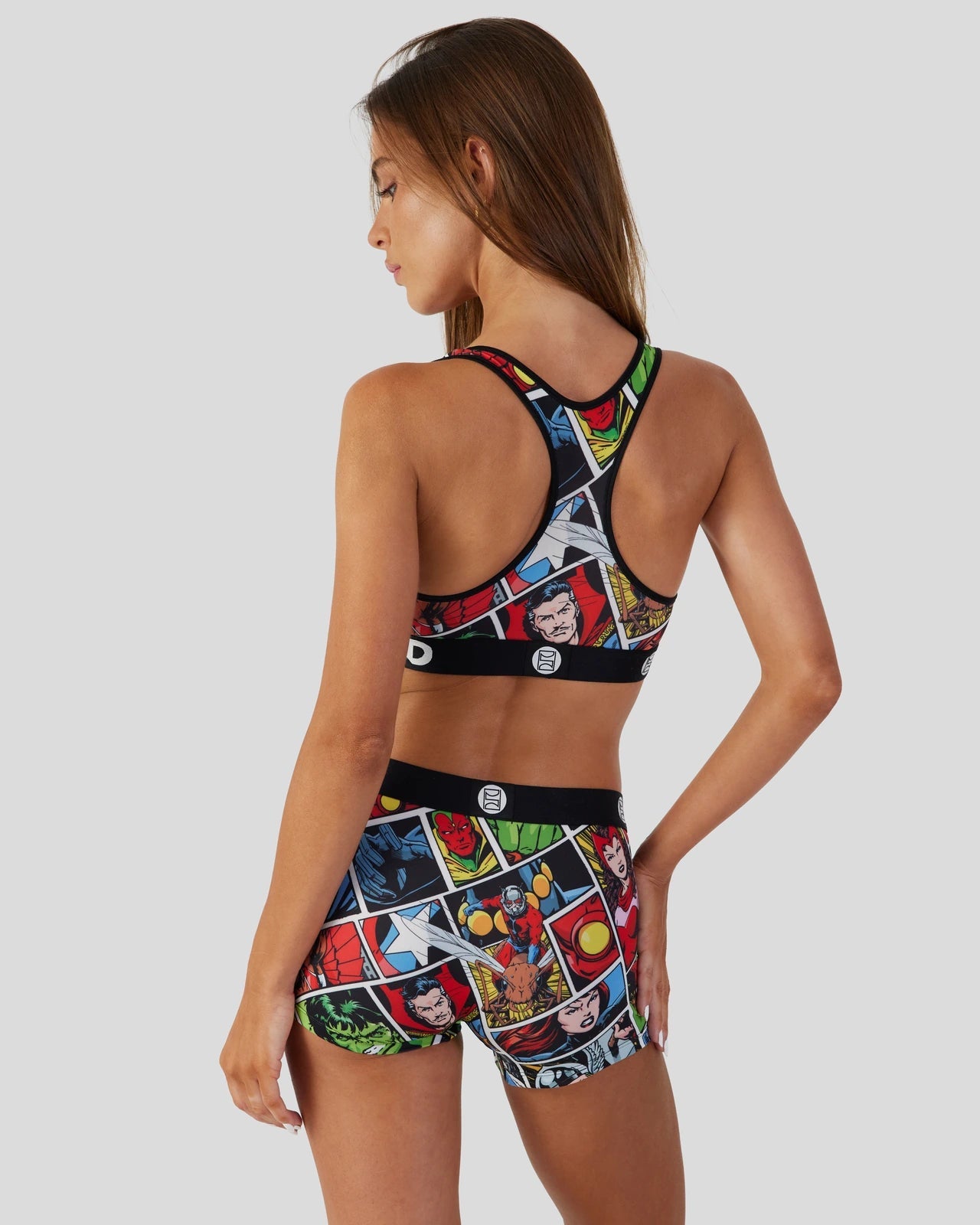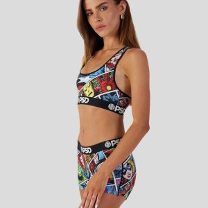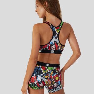 Featuring a retro comic strip. this Marvel Comics bra design includes images of beloved characters from the comic book like Dr. Strange. Captain America. Iron Man. and Ant-Man. Made with our silky poly blend. the Sports Bra is breathable yet slightly compressive. the perfect bra bringing you the comfort. style. and support you need for everything you get into.