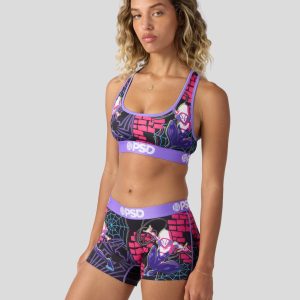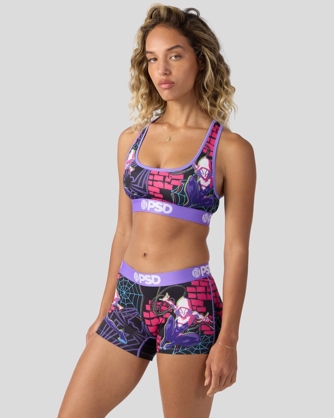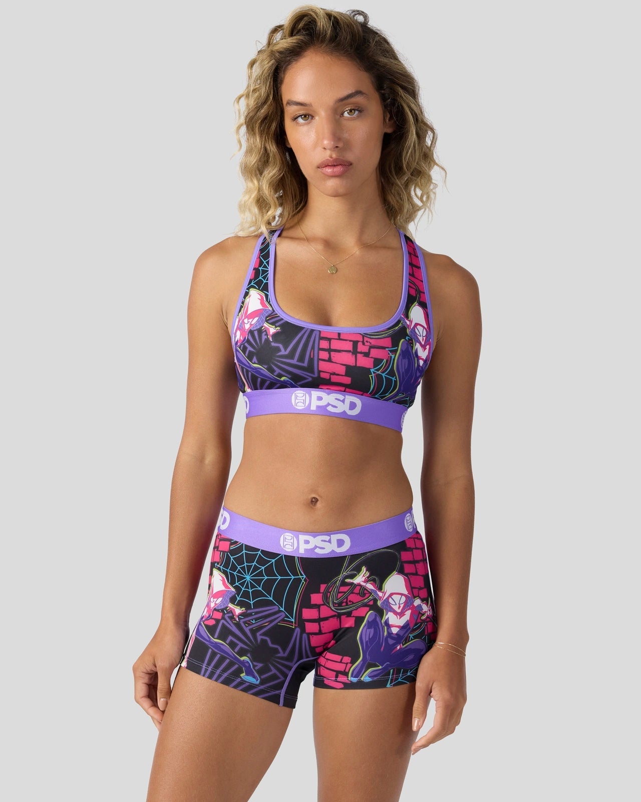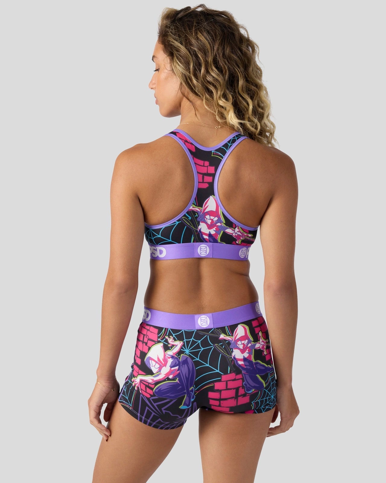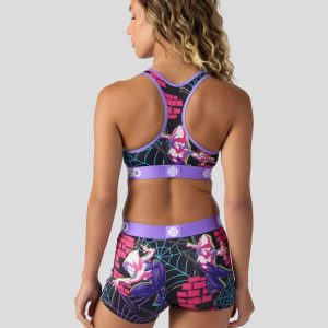 Part spider. all Super Heroine. Swing into action in this new look from Marvel. The Ghost-Spider Pop Sports Bra is made from a silky poly blend and is breathable yet slightly compressive. bringing you the comfort and support you need for everything you get into.