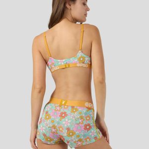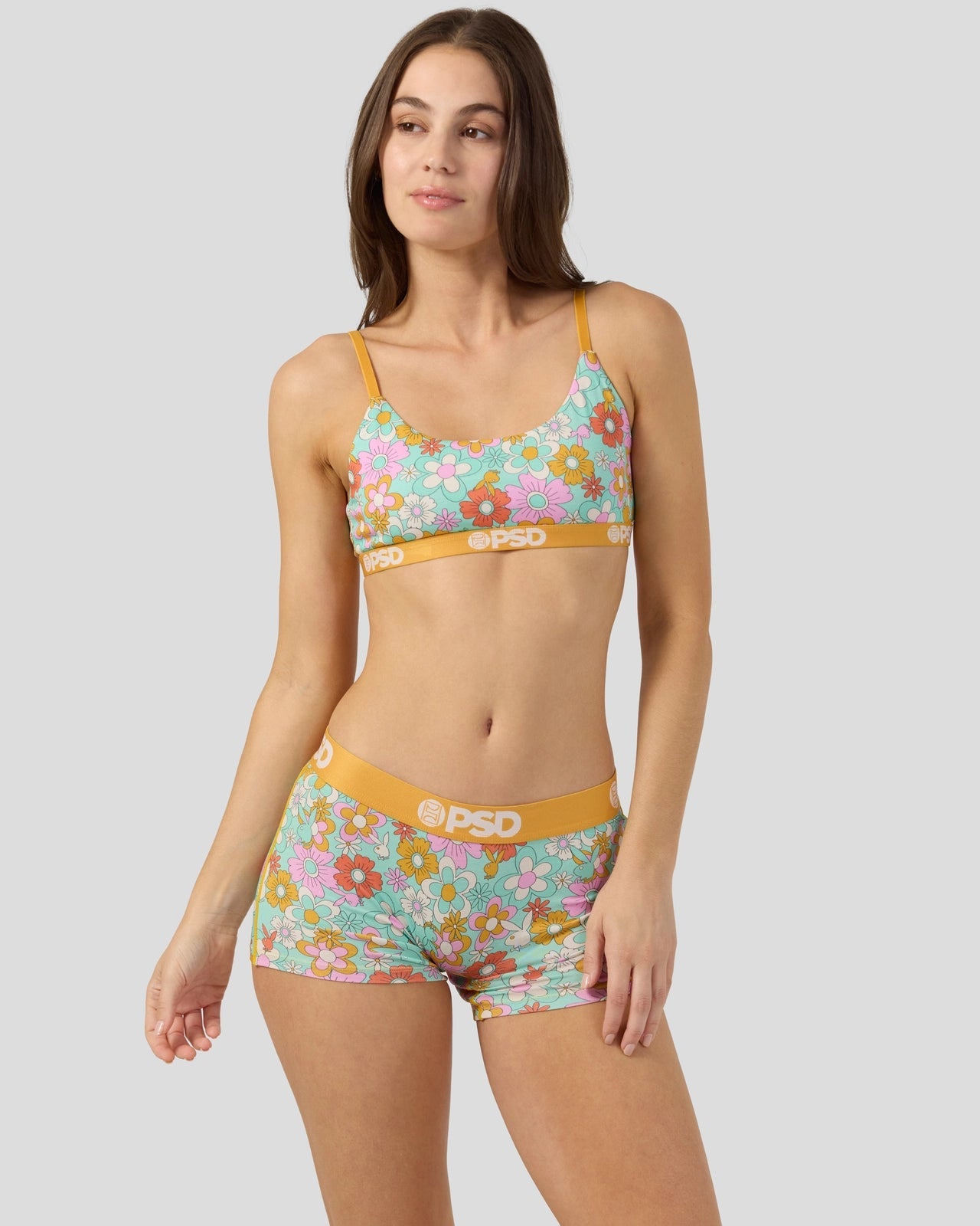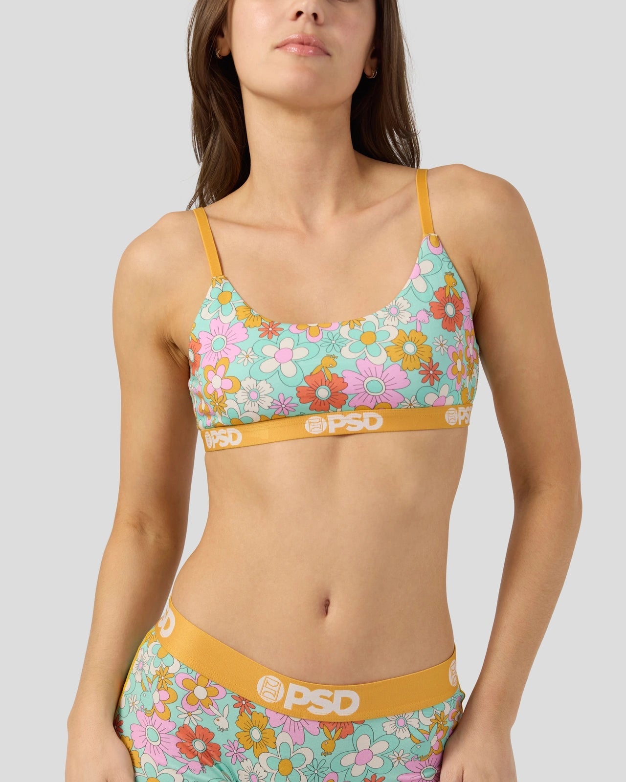 Our latest women’s drop from Playboy x PSD features a groovy ’60s-inspired print in pretty pastel colors. Made of super soft Modal. the Florid Modal Scoop Bralette almost feels like you’re not wearing a bra at all. It’s fully lined and features include adjustable straps. a cute scoop neckline. and a soft microfiber band that won’t ride or rub.