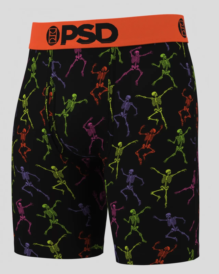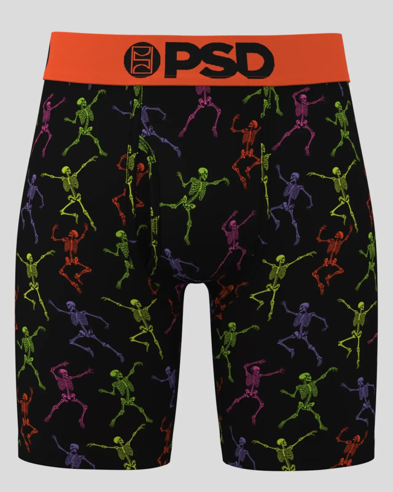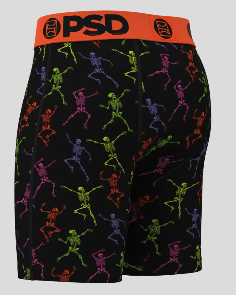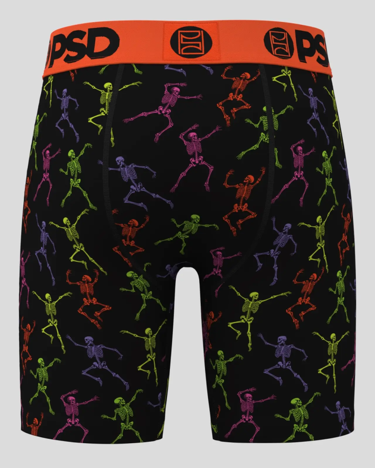 Turn up the fright in full color. This glow-in-the-dark style packs the dance floor with skeletons in electric neon hues—grooving. twisting. and bringing the undead energy. The Skeleton Dance Modal briefs are made of a super soft modal blend. They’re built for everyday wear. especially when looking for a more traditional. less silky underwear feel.