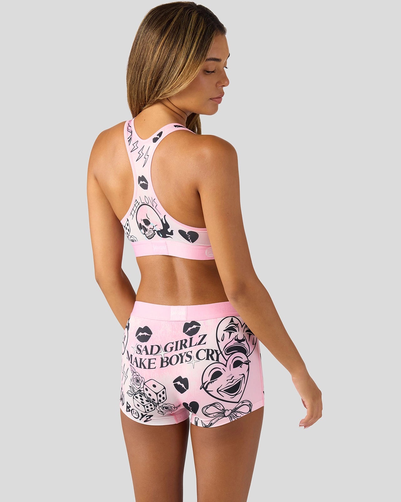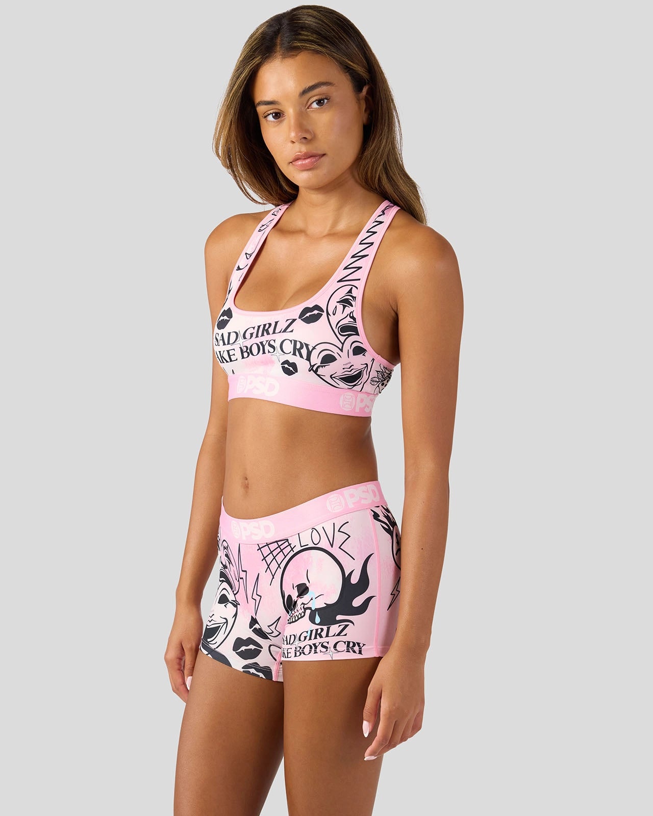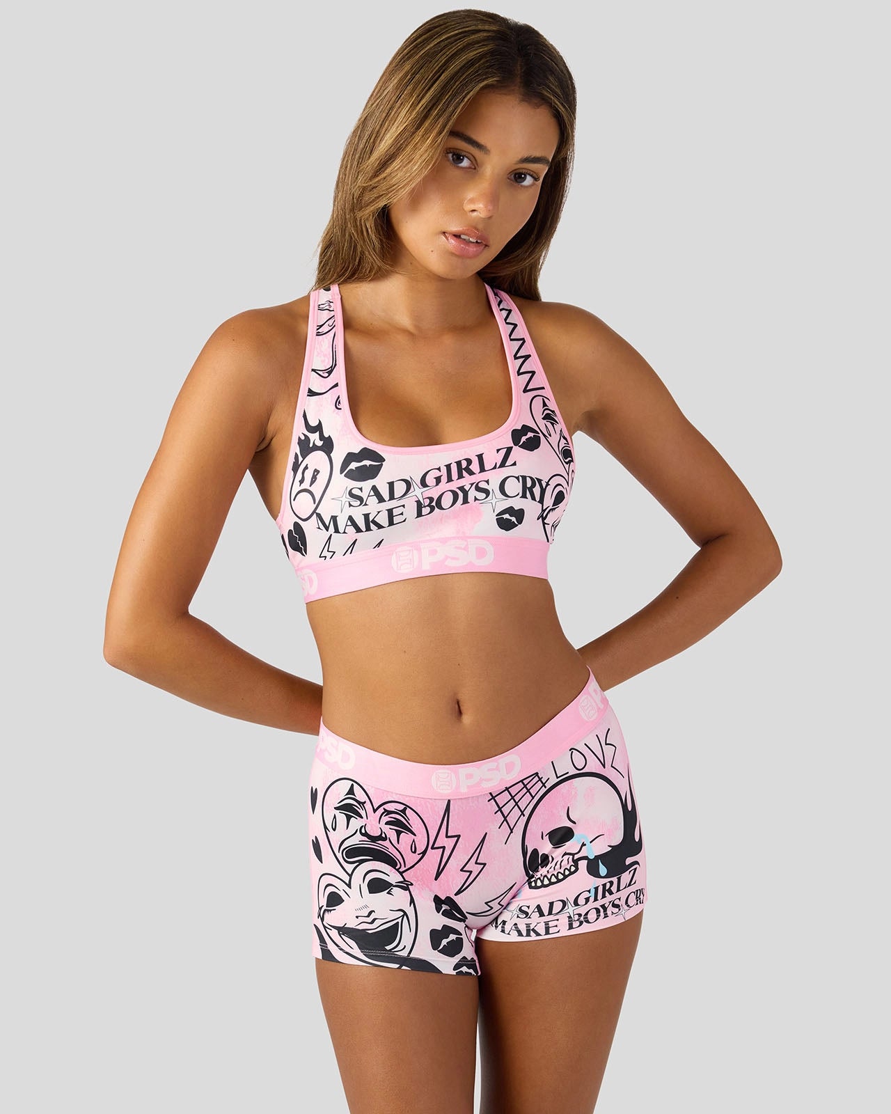 Introducing Sad Girlz x PSD. As an extension of Junior H’s Sad Boyz. Sad Girlz carries the same raw emotion and attitude. Owning heartbreak. humor. and confidence. and built for those who laugh. cry. and thrive through it. the Laugh and Cry Boy Short is made from a silky poly blend with a comfortable full-coverage. keep-you-in fit. The PSD boy shorts are perfect for everyday wear and working out.