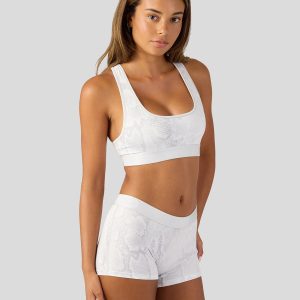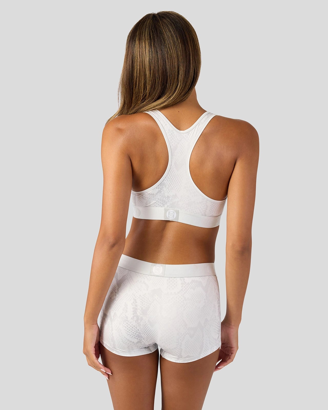 Take a walk on the wild side and slither into this new look. The Silver Snake Sports Bra is made from a silky poly blend that’s breathable yet slightly compressive. bringing you the comfort and support you need for everything you get into.