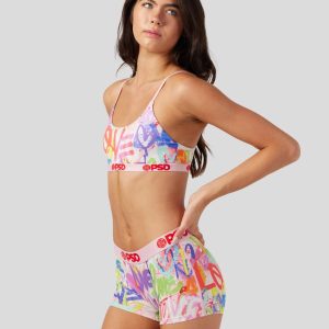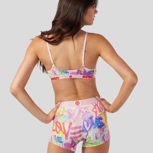 Our newest bralette shows off the softer side of street art with a tagging-inspired print you’ll love. Made of our silky poly blend. the Street Love Scoop Bralette almost feels like you’re not wearing a bra at all. It’s fully lined and features include adjustable straps. a cute scoop neckline. and a soft microfiber band that won’t ride or rub.