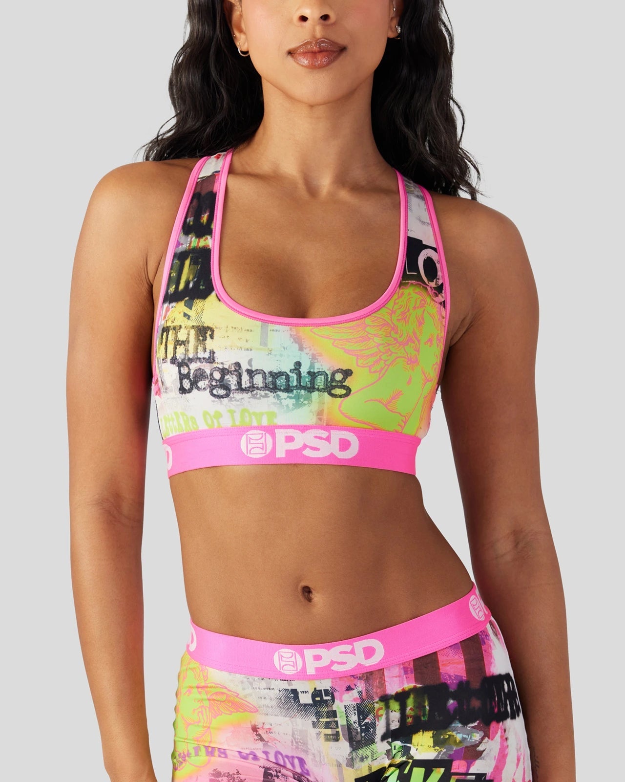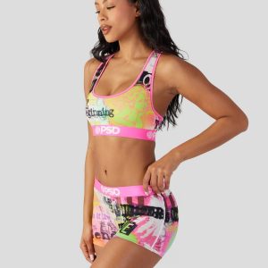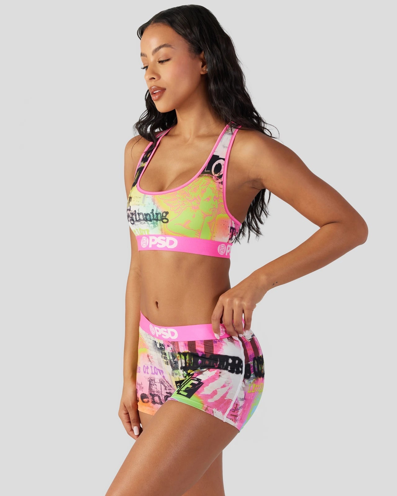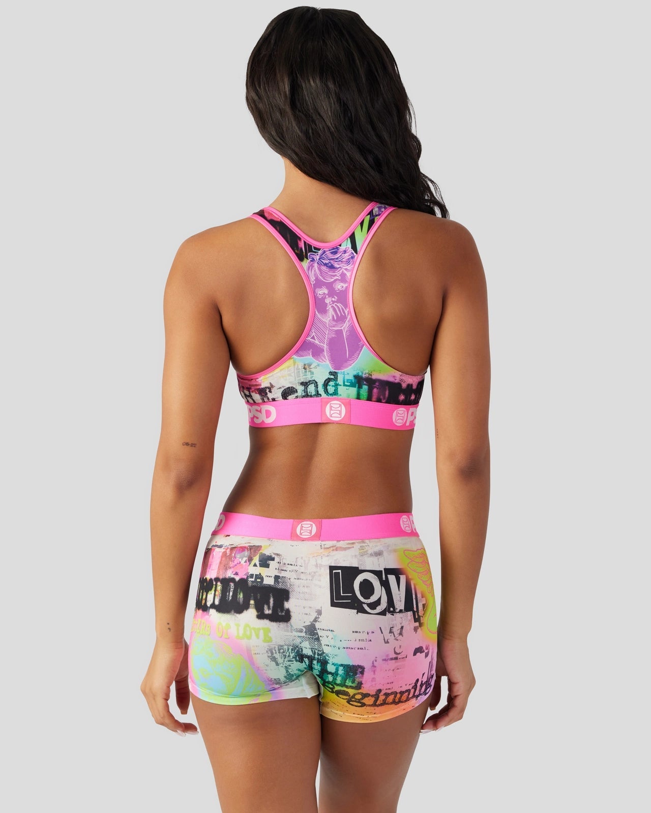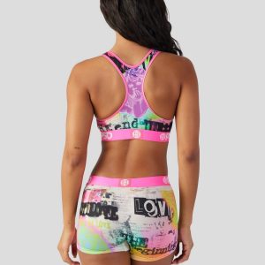 Add some edge to your collection with this ’90-inspired grunge print. The Stupid Cupid Sports Bra is made from a silky poly blend with a comfortable full coverage. keep-you-in fit. The PSD boy shorts are perfect for everyday wear and working out.