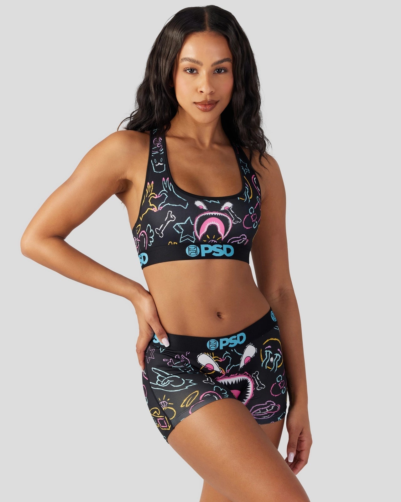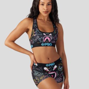 Introducing the latest Warface look to join the collection. Featuring our signature Warface alongside neon-colored doodles. the Warface Scribe Sports Bra is made from a silky poly blend with a comfortable full coverage. keep-you-in fit. The PSD boy shorts are perfect for everyday wear and working out.